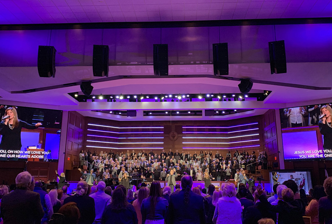 기존 음향 시스템이 노후화되면서 예배당 곳곳에 핫스팟과 콜드스팟이 발생하였고, 기술팀이 일관된 청취 경험을 제공하는 데 어려움을 겪었습니다. 일부 구역에선 음량이 너무 커서 불편을 호소하는 반면, 다른 곳은 거의 들리지 않을 정도였습니다. 기술 디렉터 데이비드 멘도자는 이 문제를 철저히 개선할 뿐 아니라, 150인조 합창단 뒤에서도 연설의 명확도와 오케스트라 음악의 다이내믹 레인지가 완벽하게 재현되길 원했습니다. 게다가, 기존 좌우(L/R) 전통적 스피커 설정은 무대와 조명을 가려 상당수 신도들의 시야에 방해가 되고 있었기에, 이 부분도 함께 개선이 필요했습니다.